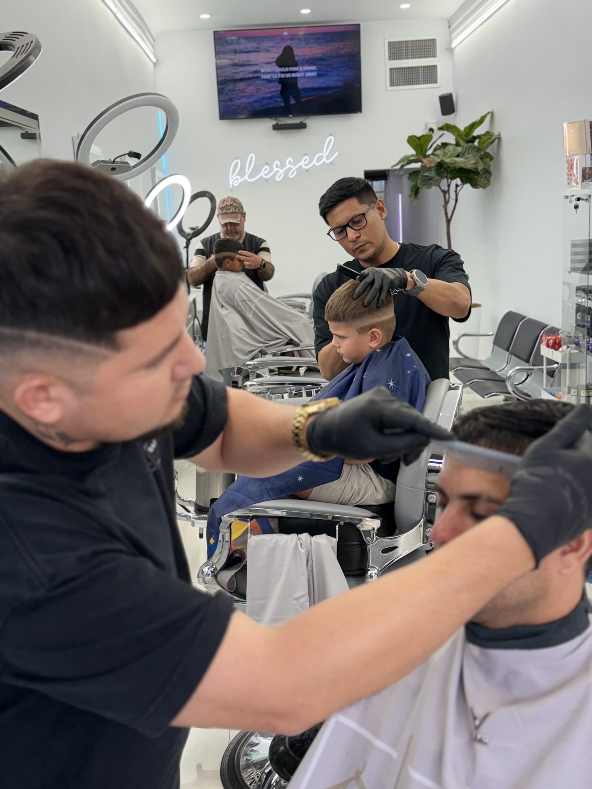We offer professional haircuts, skin fades, beard trims, hot towel shaves, styling, kids’ haircuts, facial treatments, and full grooming services.